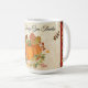 Personalisieren Sie diese einzigartige "One of a Kind" Erntedank Pumpkin Tasse! Es verfügt über einen wunderschönen Orangen Kürbis, umgeben von Herbstlauben in Orangen- und Grüntönen mit Orangen Berries und Braunen Pilzen und dem Christlichen Zitat..."In allem gibt Dank!"! Dies ist ein Original Art Design von Künstler Kerry Miller.
