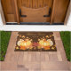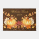 Eleganter Erntedank und Herbstthematische Haustür mit Kürbis und Blätter-Design. Braune Matten mit orangefarbenen, roten und goldenen Herbstfarben und zwei Textstellen. Die erste Zeile dient der Begrüßung der Gäste, die zweite ist die Hausnummer.