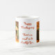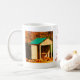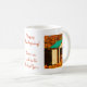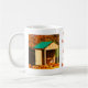 Es ist Herbst und Kürbis zum Verkauf! Kaufen Sie etwas für Erntedank oder einfach nur einen guten Kürbiskuchen. In dieser Tasse befindet sich ein kleiner Holzkürbisständer mit kontrastierendem grünem Dach. Die Kürbis werden vorne angezeigt, und im Hintergrund bläst ein glänzender Ahornbaum aus Gold, Gelb, Rot und Orange. Der Text lautet: Glückliches Erntedankfest! Es gibt so viel zu danken für... Sie können es an Ihre Bedürfnisse anpassen.