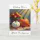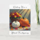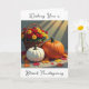 Eine hübsche Karte mit Segen im Erntedank, die angepasst werden kann. Das Cover hat eine hübsche Abbildung eines weißen und orangefarbenen Kürbchens, bunten Mums und Herbstlauben.