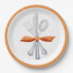 Diese Teller haben eine Aquarellmalerei aus Silberwaren, die mit einem orangefarbenen Bogen verbunden sind. Auf einem weißen Hintergrund befindet sich ein orangefarbener und weißer Polka-Punkt-Rand. Die verwendeten Farben sind orange, grau und weiß.