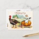 Niedliche Vintage Erntedankpostkarte, die ein junges Kochsreiten auf einem Kürbislastwagen zeigt, der durch einen Truthahn gezogen wird!