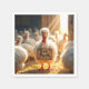 Eine Gruppe weißer Truthähne steht in einer Scheune, in der eine prominent ein Schild trägt, auf dem steht: "Schweinefleisch essen".