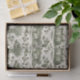 Ein klassisches monochromes Herbstmuster, inspiriert von traditionellen Toile de Jouy-Stichen und frühen ländlichen Illustrationen. In sanftem Salbeigrün auf warmem Elfenbeinuntergrund dargestellt, zeigt das Design pastorale Bauernhofszenen, Scheunen, Kürbisse, Trauben, Weizengarben, Mais, Obstkörbe, Tauben und ein sanftes Lamm, alle durch sich windende Ranken und Blätter verbunden. Die feine Linienführung und die ausgewogene Komposition rufen zeitlose ländliche Eleganz hervor.