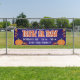 Farbenfrohe, orange und gelbe Blätter und runde, orange geerntete Kürbis schmücken dieses blaue Banner. Enthält den Text Trunk oder Leckerei. Wunderschönes Banner für Ihre "Trunk or Leckerei" Veranstaltung. Ein guter Weg, um die Community über Ihre Veranstaltung lassen.