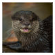 Ein asiatisch kurzer klatschte Otter nah-up, als er aus dem Wasser kam. Das Wasser fällt immer noch auf seine Whiskers. Als sich ein Partner bewegte, sah er sich ganz überrascht um, und sein Mund öffnete sich, um seine Zähne zu zeigen.