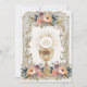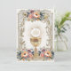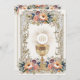 Das Sakrament der Ersten Heiligen Kommunion zu feiern ist ein wundersamer Anlass. Diese traditionell katholische Vintage First-Heilige-Kommunion-Einladung zeigt ein wunderschönes Bild von Chalice und Host, die Eucharistin überlagert auf einem verzierten goldenen Rahmen, mit einem floralen Design. Alle Texte und Schriftart können leicht modifiziert werden.