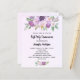 Ein violetter, lavendigerer, wasserfarbener Hintergrund. Die Einrichtung ist mit violetten und lila Blume und Grünpflanzen sowie einem goldenen Kreuz gestaltet. Personalisieren Sie Ihren Namen und Ihre Empfang-Daten und fügen Sie diese hinzu. 1 Blatt = 1 Einladung mit Druckkante bis Kante.