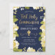 Diese moderne und hübsche Einladung der Ersten Heiligen Kommunion besticht durch eine illustrierte Blumengrenze und die goldene Formulierung "Erste Heilige Kommunion". Der Hintergrund ist marineblau, kann aber beliebig farblich angepasst werden. Auf der Rückseite des Einladens befindet sich ein goldenes Quatrefolienmuster mit einem passenden blauen Hintergrund, das auch ausgetauscht werden kann. Der Text ist für Ihre besondere religiöse Veranstaltung anpassbar.