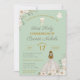 Atemberaubende Erstkommunion Blumeneinladungen mit rustikalen, Vintagen inspirierten Elementen mit Mädchen in traditionellem weißem Kleid, vor einem weichen Salbei grün Hintergrund. Die Rückseite der Einladung ist mit einem boho Stil Kreuz mit Aquarellfarben Blume und Grün. Tauschen Sie 'Erste Heilige Kommunion' gegen 'Feiern' oder 'Taufe' aus, je nachdem, welcher Anzug Ihre besondere Veranstaltung ist.