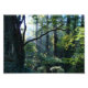 Brillante, weiße Sonnenstrahlen der Morgensonne, die von hinter dunklen Ästen in einen üppigen, grünen Sommerhwald strömen, mit massiven Efeu-Bäumen und fruchtbarem Unterholz.