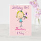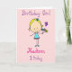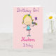Niedlich rosa Geburtstagskarte würde jedes kleine Mädchen Liebe. Ein hübsches Cartoon mit blonden Haaren, rosigen Wangen und einem süßen Lächeln. Sie trägt ein blaues Kleid mit einem rosa Spitzentanz und blauen Schuhen. Sie hat ein paar Blume in der Hand. Über der Kartenspitze in lila Text befinden sich die Worte "Geburtstagskarte". Im unteren Teil können Sie mit der Vorlage den Namen auf der Karte ändern, indem Sie den Beispieltext ändern. In der Karte ist eine Vorlage, um Ihre ganz eigene Geburtstagsnachricht hinzuzufügen.