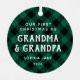 Dieser rustikale Schmuck ist der perfekte Sake für Erstgroßeltern. Die Vorderseite des Ornaments zeigt ein weißes Typografie-Design, das "Unser erstes Weihnachten als Oma & Opa" in rustikaler Schrift auf einem grünen und schwarzen karierten Hintergrund ausdrückt. Passen Sie den Text mit den Spitznamen für die Großeltern Ihrer Familie an, und fügen Sie den Namen und das Geburtsjahr des Enkels unten hinzu. Auf der Rückseite können Sie ein vollgroßes Foto des neuen Babys hinzufügen.