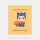 Ein hübsches Baby in einem schwarzen Katzenkostüm mit einem großen orangefarbenen Bogen trägt einen Lollipop mit einem Schädelbild. Ein gebogener Kürbis steht etwas dahinter. Babys erste Einladung zum Halloween-Party, jedes Geschlecht.
