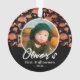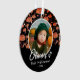 Erste Halloween Orange Mushroom Fall Foto Ornament. Liebliches, orange-schwarzes Pilzmuster in Herbstfarben, der Name eines Babys in einem modischen Drehbuch. Personalisieren Sie das Ornament mit dem Foto, dem Namen und dem Jahr Ihres Babys. Ein schöner Halloween-Feiertag.