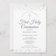 Eine elegante First-Holy-Kommunion Save the Date-Einladung mit zartem silbernen Sternenstaub. Sie können mit Ihren besonderen Feierlichkeiten in schicken silbernen Text personalisieren. Entwickelt von Thisisnotme©