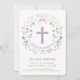 Diese moderne und trendige Einladungskarte der First Holy Communion besticht durch einen illustrierten Kranz von Blume, der ein Kreuz mit den Worten "Erste Kommunion" in einem eleganten Schriftart mit Schrift umschließt. Die Rückseite ist lila (kann beliebig farblich angepasst werden), mit einem weißen Quartrefolienmuster darüber. Eine perfekte und persönliche Art, Gäste zu einem besonderen Sakrament eines Kindes einzuladen.