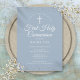 Eine elegante First-Heilige Kommunion Save the Date Einladung mit zartem silberfarbenem Sternenstaub auf staubblauem Hintergrund. Sie können mit Ihren speziellen Feierlichkeiten in schicken Text personalisieren. Entwickelt von Thisisnotme©