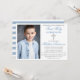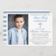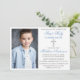 Moderne Elegante Dusty Blue und Silver First Heilige Kommunion Einladung mit Kreuz und Foto. Blau-weiße Streifen auf der Rückseite.
