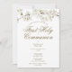 Eine elegante erste, heilige Kommunion Save the Date Karte mit zarten weißen Blüten, die Ihre ersten heiligen Kommuniondetails in eleganter Goldtypografie umrahmen. Entwickelt von Thisisnotme©
