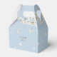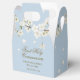 Moderne, blumengeschmückte erste heilige Kommunion-Gunst-Box mit zarter weißer Blüte auf staubblauem Hintergrund mit Ihrem besonderen Event-Information-Set in eleganter Goldskripttypografie. Sie können mit Ihrer eigenen Danksagung auf der Rückseite personalisieren. Ein perfekter Weg, um sich bei Ihren Gästen zu bedanken! Entwickelt von Thisisnotme©