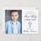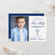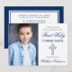 Elegantes Blau und Silber Erste Heilige Kommunion Einladung mit Kreuz und Foto.