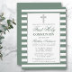 Elegante Erste Heilige Kommunion Einladung mit Kreuz. Die Streifen sind grün und weiß. Silberkreuz.