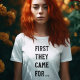 ZUNÄCHST KAMEN SIE FÜR ... geschrieben in fett, senkrechten schwarzen Buchstaben. Dieses Shirt ist in verschiedenen Stilen, Größen und Farben erhältlich.