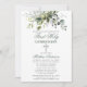 Moderne Elegante Erste Heilige Kommunion Einladung beinhaltet Aquarellfarben Eukalyptus-Blätter und andere schöne botanische Grünpflanzen. Silberkreuz. Legen Sie die Farbe grün zurück.