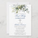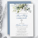Moderne Elegante Erste Heilige Kommunion Einladung beinhaltet Aquarellfarben Eukalyptus-Blätter und andere schöne botanische Grünpflanzen. Silberkreuz. Dusty Blue Back.