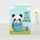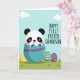 Entworfen mit einer süßen Frühlingskulisse zeigt diese Karte ein rundgesichtiges Baby-Tier mit schwarzen Flecken um die Augen und Ohren, das aus einer großen Eierschale lugt, als ob es gerade zu einer ersten Feier ankommt 🐰. Die weichen rosa Wangen und die sanfte, nach vorne geneigte Haltung des kleinen Wesens geben ihm ein liebevolles, fast kuscheliges Aussehen. Die übergroße Schale ist türkis mit einem breiten violetten Band, das tief in einem grasbewachsenen Vordergrund sitzt, der frisch und einladend wirkt. Um sie herum liegen kleinere verzierte Eier in sonnigem Gelb, gestreiftem Türkis und gepunktetem Violett im Gras, als wären sie dort für einen gemeinsamen Familienmoment hingelegt worden 🌷. Ein hellblauer Himmel erstreckt sich hinter allem, gepunktet mit bauschigen weißen Wolken, die die Szene ruhig und hell halten. Auf der rechten Seite steht der Text „HAPPY FIRST EASTER GRANDSON“ in Großbuchstaben, in einem dunklen Ton, der sich deutlich vom hellen Himmel abhe