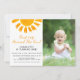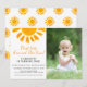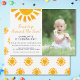 Hast du vor, ein Mädchen zum ersten Geburtstag zu einem Thema zu machen? Diese niedliche Einladung ist mit einer gelben Aquarellsonne, einer stilvollen Schriftzeichen-Typografie und einem Sonnenmuster auf der Rückseite dekoriert. Einfach mit Ihrem Foto und Ihren Details anpassbar. Original Wasserfarbe © Michele Davies.