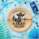 Erste Rodeo niedlichen Cowboy-Geburtstagsgeschirr Geburtstagsparty personalisierte Teller, bezauberndes braunes Babypferd in einem Cowboys-Hut und dekorierte Sattel auf Arizona Landschaft für Cowboys Western themed Geburtstagsparty.