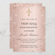 Eine Rose Gold Imitate metallisch aussehend Hintergrund. Mit Rose Gold, rosa Imitat Glitzer Staub und ein Kreuz dekoriert. Personalisieren und fügen Sie einen Namen und Details. Der Name wird mit einem handgeschriebenen Stilskript geschrieben