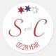 Auf diesem Aufkleber befinden sich die Braut- und Bräutigam-Initialen in Rot mit dem Hochzeitstag und die roten, weißen und blauen Sterne oben. Personalisieren Sie den Text in den Vorlagenfeldern, oder passen Sie ihn an, um einen Schriftart auszuwählen, den Sie bevorzugen. Ideal zum Versiegeln von Postsendungen oder Begehrensäcken.