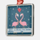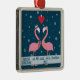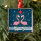 Die Einrichtung dieses Weihnachtsbaumes besteht aus zwei rosa eleganten Flamingos, männlich und weiblich, die sich gegenüberstehen, wobei zwischen ihnen ein rotes Herz hängt. Der Hintergrund ist blau, mit weißen Schneeflocken. Der anpassbare Text auf einem weißen Streifen lautet "Unser erstes Weihnachten als Herr und Frau Jackson".