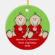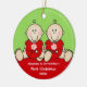 Unsere erste Weihnachtsverzierung kennzeichnet ein entzückendes Paar des Babyjungen-Zwillings-Sets auf einer roten u. grünen Polka punktierter Hintergrund! Personifizieren Sie mit Ihren Babyinformationen und Datum und Sie sind alles Set, zum zu gehen! Wunderbares datiertes Andenkengeschenk für das 1. Weihnachten Ihres Babys.
