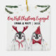 Erste Weihnachten verlobt oder zusammen oder verheiratete Ornamente. Liebliches Pinguinpaar mit Weihnachtsmannmütze und Rudolph Rentierhornen. Aktualisieren Sie mit Ihren Namen und Datum, es ist eine Vorlage!