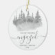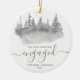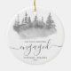 Erinnern Sie sich an Ihre Verlobung mit diesem wunderschönen rustikalen Sake-Ornament. Der graue Text lautet "Unser erstes Weihnachten verlobt", mit dem Wort "verlobt" in eleganter Schrift mit Schnörkeln vor und nach. Die Aquarellbilder zeigen eine Winterwaldlandschaft mit immergrünen Bäumen in Grautönen.