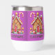 Erste Weihnachten in unserer neuen Zuhause. Lebkuchenhaus, Bonbons, Kaubällchen und Lollipops.Lavendel Hintergrund.