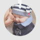 Feiern Sie Ihr erstes Weihnachten zusammen mit dieser schönen Abbildung einer weißen blonden kaukasischen Frau mit denim Hose; Ein Weihnachtshut und ein weißes Oberteil stehend mit ihrem Rücken zu Ihnen. Sie hält ein weißes Kaukasierkind, das auch einen Weihnachtshut des Vaters trägt und von einem Holzrahmen gerahmt ist, der mit zarten roten Beeren, Baumwollbällen, Kiefernzapfen und Tannenpfannen und den Worten, unserem ersten Weihnachtsfest, gefolgt vom Jahr, ausgestattet ist. Auf der Rückseite befindet sich eine Vorlage für Ihr benutzerdefiniertes Foto.