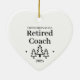 Erste Weihnachten als ein pensioniertes Coach Herzornament für eine Pension. Elegante Porzellan Keramik Urlaubsornamente in Weiß mit schwarzer Schrift. Mit Weihnachtsbäumen und Sternen.