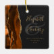 Dieses elegante, moderne Ornament besticht durch ein verbranntes, orangefarbenes Aquarelldesign, das mit vergoldetem Glitzer aus Imitaten bestickt ist. Der goldfarbene Text lässt sich leicht auf schwarzem Hintergrund anpassen, wobei die Namen der Braut und des Bräutigams in skurriler Kalligraphie in Handschrift über einen großen grauen Ampersand stehen. Die Worte "Erste Weihnachten Verheiratet" erscheinen in Serif-Schriftart zusammen mit dem anpassbaren Jahr.