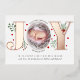 Rose Goldfolie Freude mit Beeren Erste Weihnachtsgeburten Foto Feierabend Geburt Ankündigung. Es zeigt das Wort "JOY" in Rose Goldfolie mit roten Beeren und Grünpflanzen, während anstelle des Buchstabens "O" Ihr Foto ist. Auf der Rückseite befinden sich gustische Rose rosa alte Polka-Punkte.