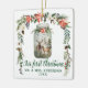 Elegantes Kalligraphie-Script, Unser erstes Weihnachtswatercolor Winter Floral Deer Ornament umfasst rote Poinsettien, weiße Rose, Kiefernzapfen, Baumwolle und Wintergarten. Wasserfarbener Mason Glas mit Reh und Buck im Pinienwald.