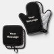 Sie können Ihre eigene Nachricht in weißem Text auf diesem schwarzen Ofen Mitt und Pot Inhaber Set erstellen.