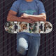 Machen Sie Ihr eigenes Fotomaterial Template Custom Made Skateboard Deck aus Ricaso - bitte schneiden Sie Bilder vor dem Hochladen, wenn nötig. Fügen Sie Ihre eigenen Fotos, Ihre eigene Kunst etc (keine Copyright-Bilder bitte), dieses Deck nimmt 8 Einzelbilder in seiner Collage .