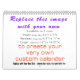 Erstellen Sie Ihren eigenen personalisierten Kalender - Wir haben dies so einfach gemacht, ersetzen Sie einfach die Bilder mit Ihren eigenen, wir haben die Größe Bilder für Sie verwenden, abhängig von der Kalendergröße, die Sie gewollt - Erstellen Sie Ihren eigenen personalisierten Kalender - Fügen Sie Ihre eigenen Fotos, Kunstwerke oder Designs zu diesem Custom Create Your Own Kalender - Hinzufügen Sie Text zu ändern - Schriftart, Größe und Farbe von Schriftart, um Ihre Bedürfnisse Anzug. Stellen Sie sicher, dass die Dropdown-Liste für Kultur, Urlaubsoptionen, Startdatum, Größe, Bindungsfarbe etc. alle Optionen auf der rechten Seite angezeigt werden, bevor Sie bestellen -