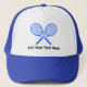Erstellen Sie Ihren eigenen blauen Tennis Player Trucker Hut mit schwarzem Text speziell.