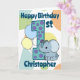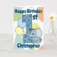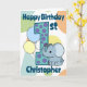 Eine bezaubernde Geburtstagskarte, um den ersten Geburtstag Ihres Babys zu feiern. Auf der Vorderseite der Karte ist eine große Nummer eins in blau mit lila Flecken. Über der Zahl befinden sich die Worte "Happy Birthday" in blauer Schrift. Unter der Zahl ist eine Vorlage auch in blau, um Ihren Namen hinzuzufügen. Vor der Zahl ist ein niedlicher Cartoon grauer Elefant. Hinter dieser Zahl befinden sich zwei Ballons, einer in blassblau und einer in blassgelb. Der Hintergrund ist weiß mit blauen, grünen und orangefarbenen Formen. Im Inneren der Karte befindet sich eine Vorlage, um Ihre eigene Geburtstagsnachricht hinzuzufügen.